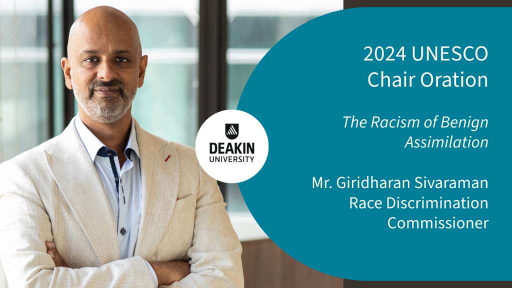- 2024 UNESCO Chair Oration: Mr Giridharan SivaramanThe 2024 UNESCO Chair Oration was delivered by Mr Giridharan Sivaraman, Australia’s Race Discrimination Commissioner, on ‘The Racism of Benign Assimilation’.
